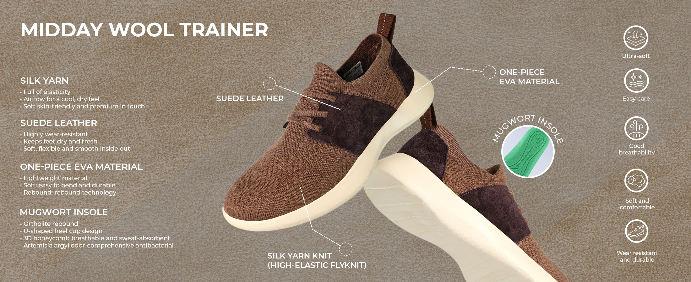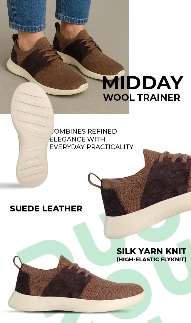 The DA Midday Wool Trainer combines luxury-grade softness, breathable performance, and flexible resilience in one sleek silhouette. With its silk yarn knit texture, suede details, and lightweight cushioning, it’s the ultimate choice for those who appreciate comfort that feels as good as it looks — refined, modern, and made for daily life.